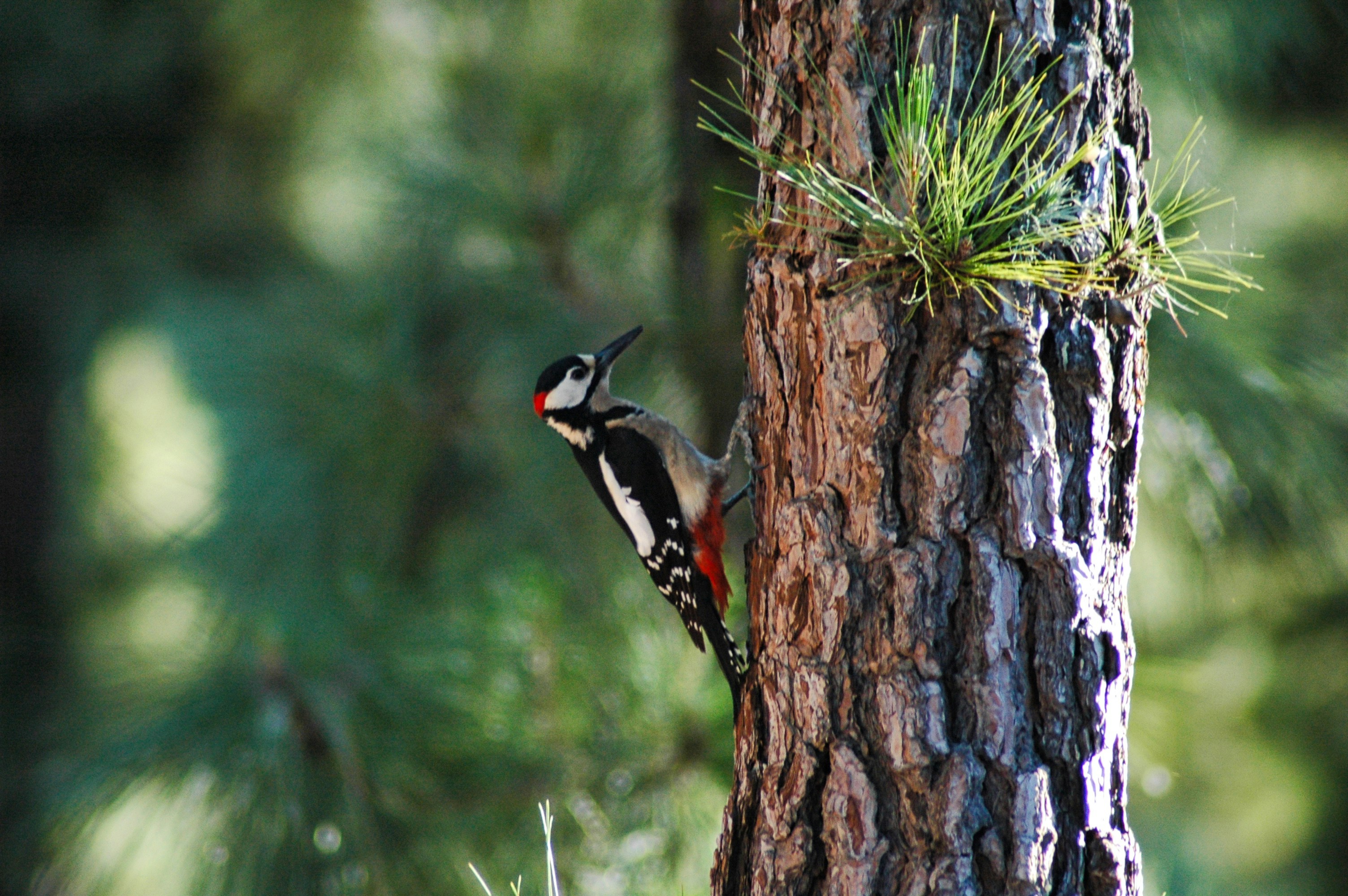A sudden woodpecker drops to a branch,
